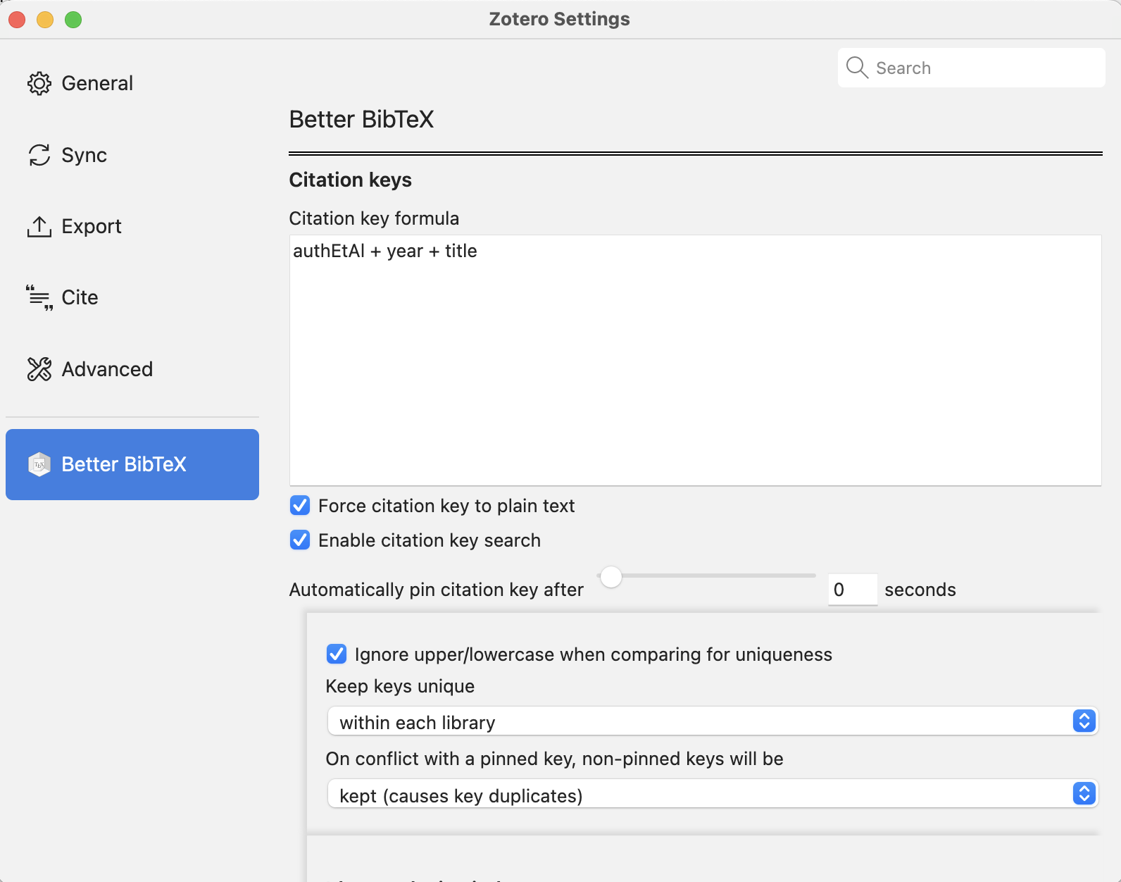 If you then go to settings/preferences you now have a BetterBibtex option. Here I change the citekey - this actually changes how the files are named/stored on your computer, so all end up unique - neat and tidy. I want authors et al. year then title so have - “authEtAl + year + title”