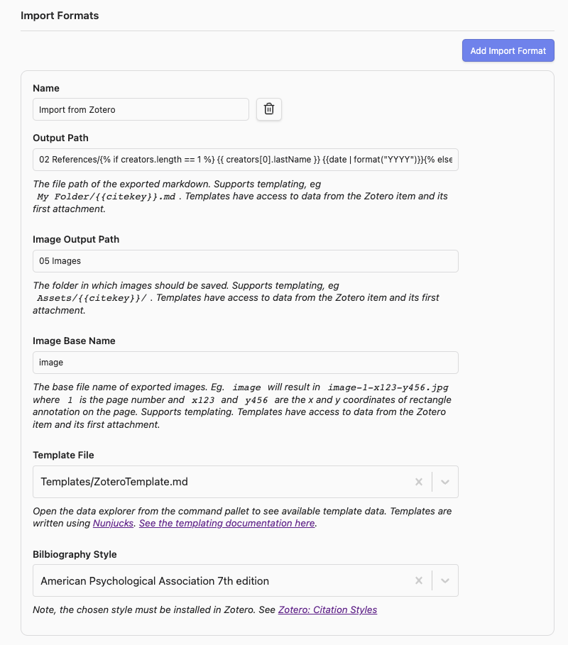 Okay lets go back to testing the import settings. Set the name of the import format. You can set up multiple/multiple templates to import. I put a name to it - very originally called “Import from Zotero”. Set the template as the template file you created above.