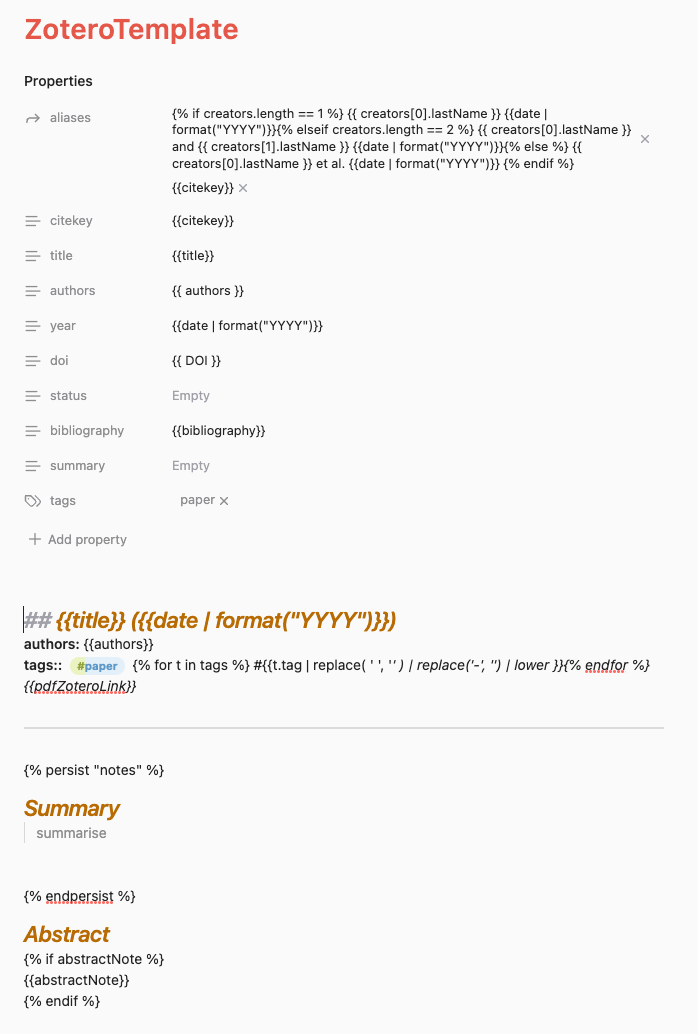 {% endpersist %}This template takes the title of the reference, the date, the list of authors, and the abstract. The section starting # Notes then has persist and end section. What you write in there will not be changed every time you reimport aka update the file.