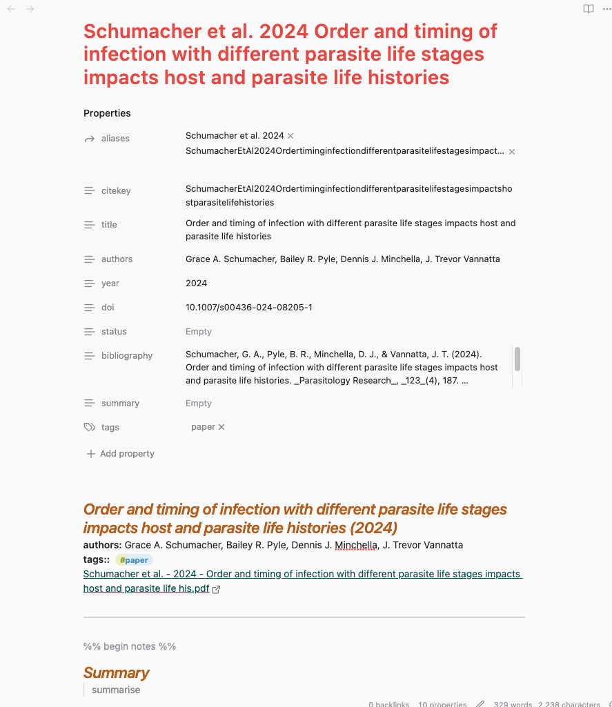 What truly sold me on Obsidian was its integration with Zotero3, my reference manager. I can import metadata from papers, organize my notes, and link everything seamlessly. With daily notes, Obsidian functions as a giant notebook for both academic and personal use.