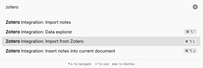 Open the command palette (cmd + P on mac) and select import from Zotero.